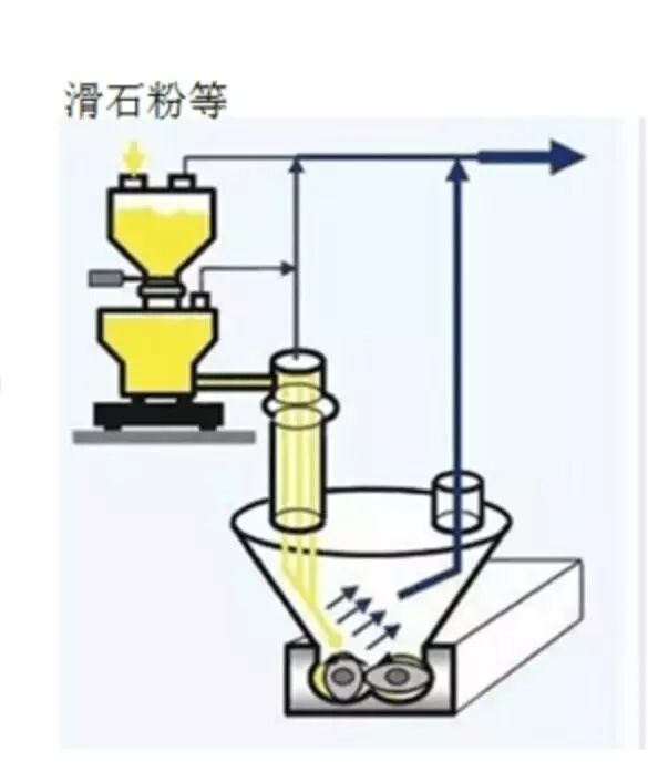 生产中另一个高度有效优化手段就是通过将粉末加入到双螺杆挤出机以提高生产效率,这种方法称为喂料强化技术(PET)。PET技术中需要投加一定的粉末,并通过对机筒施加一个真空将空气除去,而加入的粉末则留在机筒内并在在机筒上形成一个材料饼,通过增加了机筒上的摩擦系数以提高了传输动力,达到提高输送效率的目的。同时,这些加进去的粉末可以有效除去机筒内的空气减少了物料的体积,提高进料量。PET技术的实际效果和粉末的特性密切相关。